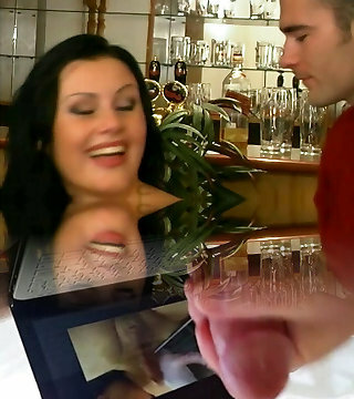 Black-haired gets her ass nutted on while bent over bar stool