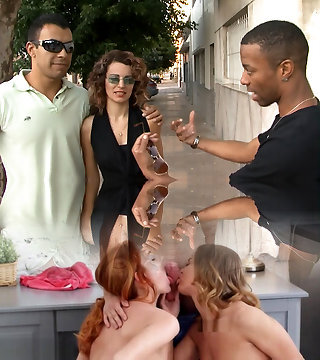 Two meaty breasted chicks take turns sucking my dick